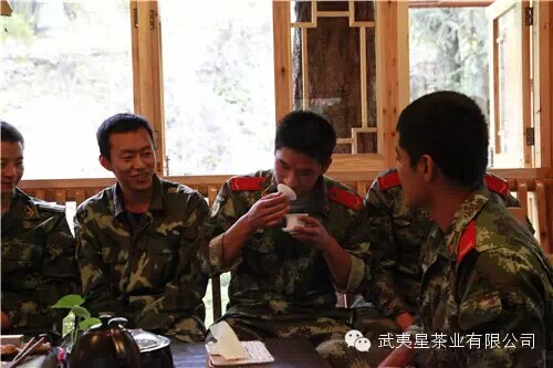 在大红袍母树旁的茶寮,大家品着红袍听我们的工作人员诉说360多年前关于大红袍的传奇故事。历经几百年的沧桑,大红袍从过去的年贡八两的贡茶、半壁江山的国礼,到现今国内外畅销的茶叶品种,已成为武夷山的骄傲。对于如今的我们,关心国防,支持军队,爱戴军人,优待军属是政府和社会的共同责任,也是武夷星肩负的责任。希望通过此次活动将“大美武夷”的精神传递给敬爱的军人朋友们,让美丽的武夷山和传奇的大红袍成为他们最难忘的回忆。