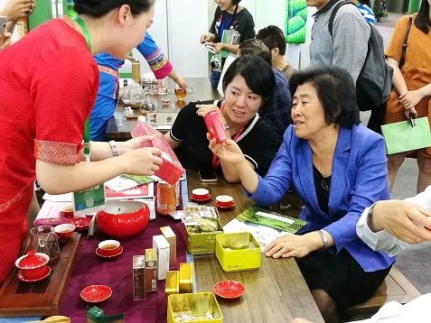 农业部党组成员、部妇工委主任张玉香女士在武夷星茶业有限公司参展馆内喝茶聊天,深入了解武夷星产品(图中为红韵大红袍)