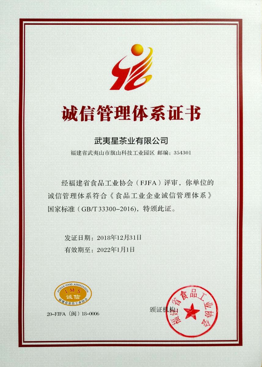 为了更好地践行“诚信、创新、感恩”的经营理念,武夷星在诚信评价体系的基础上建立诚信管理体系,并在2018年12月31日获得认证证书。