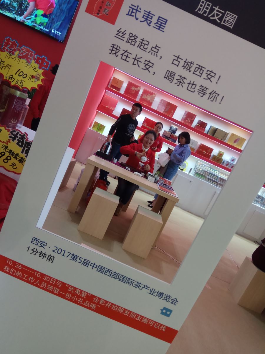 在武夷星的展区内,“微信朋友圈”成为了许多茶友们“定位”的标志。大家纷纷拿起手机与“武夷星朋友圈”合