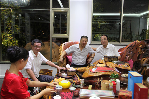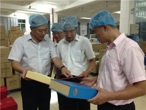 我司董事长何一心带领一行领导参观了正在生产中的武夷星包装车间。此时的包装车间内,大伙正在为中秋货品做加班补货生产。在“中国梦”系列产品生产区前,何董结合产品实物向马书记一行介绍了我公司近期推广的产品基本情况、产品特点等,并结合武夷星今年提出的口号向领导做出了“一心同筑中国梦,品茶品味品人生”的构想。
