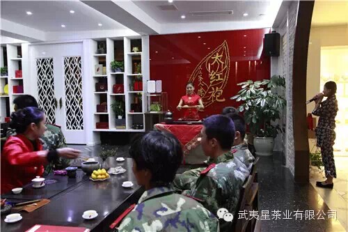 在大红袍母树旁的茶寮,大家品着红袍听我们的工作人员诉说360多年前关于大红袍的传奇故事。历经几百年的沧桑,大红袍从过去的年贡八两的贡茶、半壁江山的国礼,到现今国内外畅销的茶叶品种,已成为武夷山的骄傲。对于如今的我们,关心国防,支持军队,爱戴军人,优待军属是政府和社会的共同责任,也是武夷星肩负的责任。希望通过此次活动将“大美武夷”的精神传递给敬爱的军人朋友们,让美丽的武夷山和传奇的大红袍成为他们最难忘的回忆。