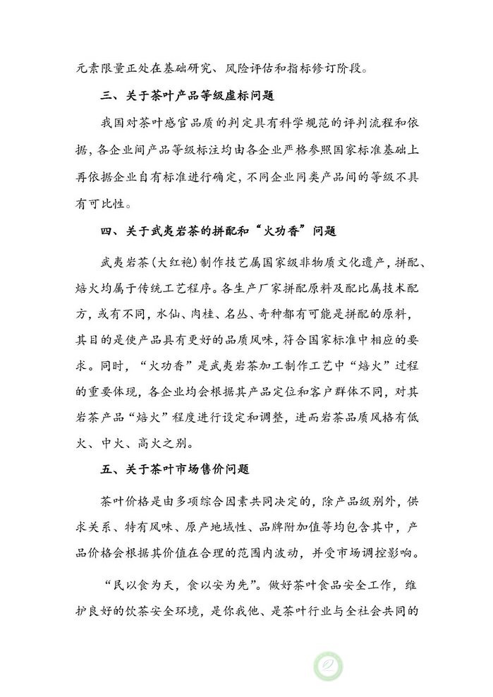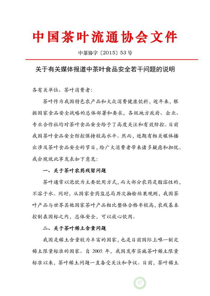 中国茶叶流通协会就近期有相关媒体播出涉及茶叶食品安全的节目,给广大消费者带来诸多疑虑和担忧,做出以下说明: